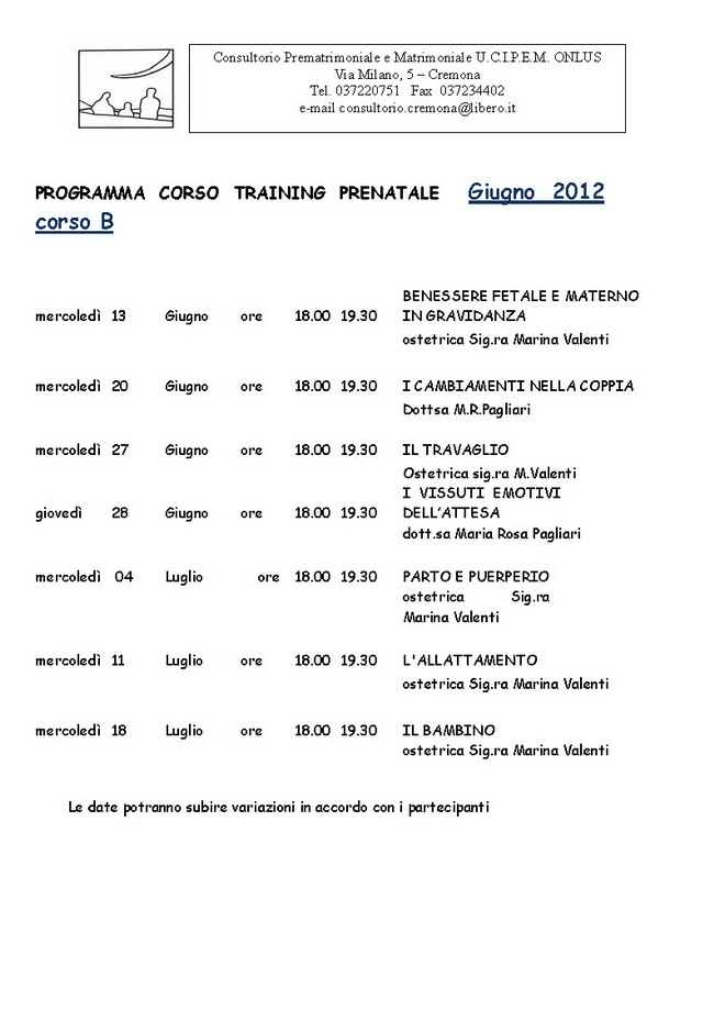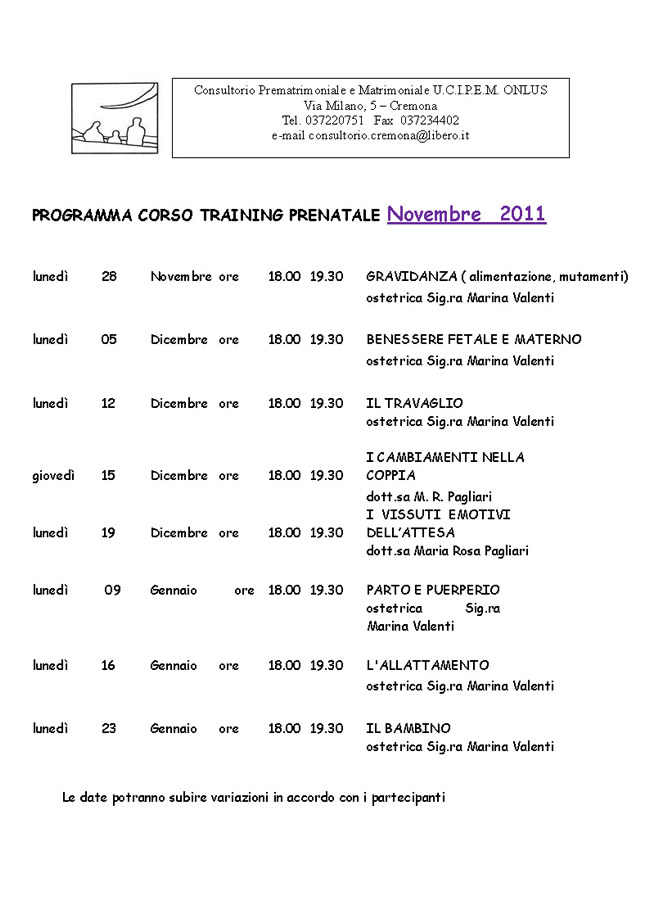 Consultorio UCIPEM Cremona Fondazione ONLUS - Via Milano, 5/C - 26100 Cremona (CR) - P.IVA: 01273220192 - C.F.: 80011480193 - Privacy policy