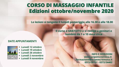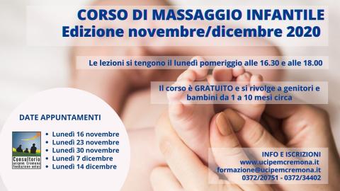 Si informa che, avendo raggiunto il numero massimo di partecipanti, le iscrizioni al corso di massaggio infantile edizione novembre dicembre 2020 delle ore 18.00 sono chiuse. E' ancora possibile iscriversi al corso delle 16.30.