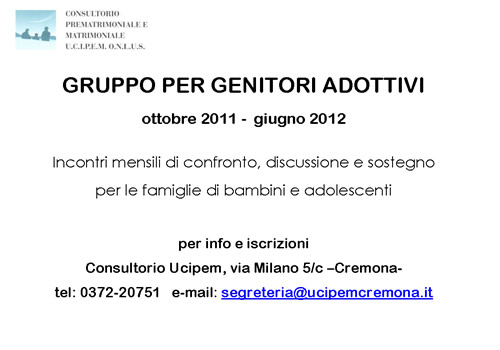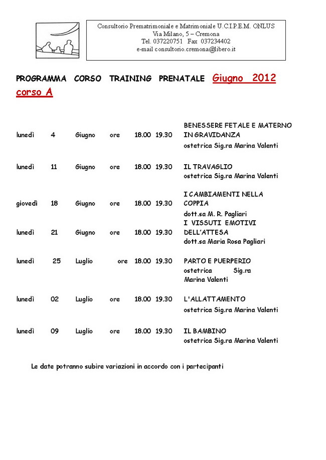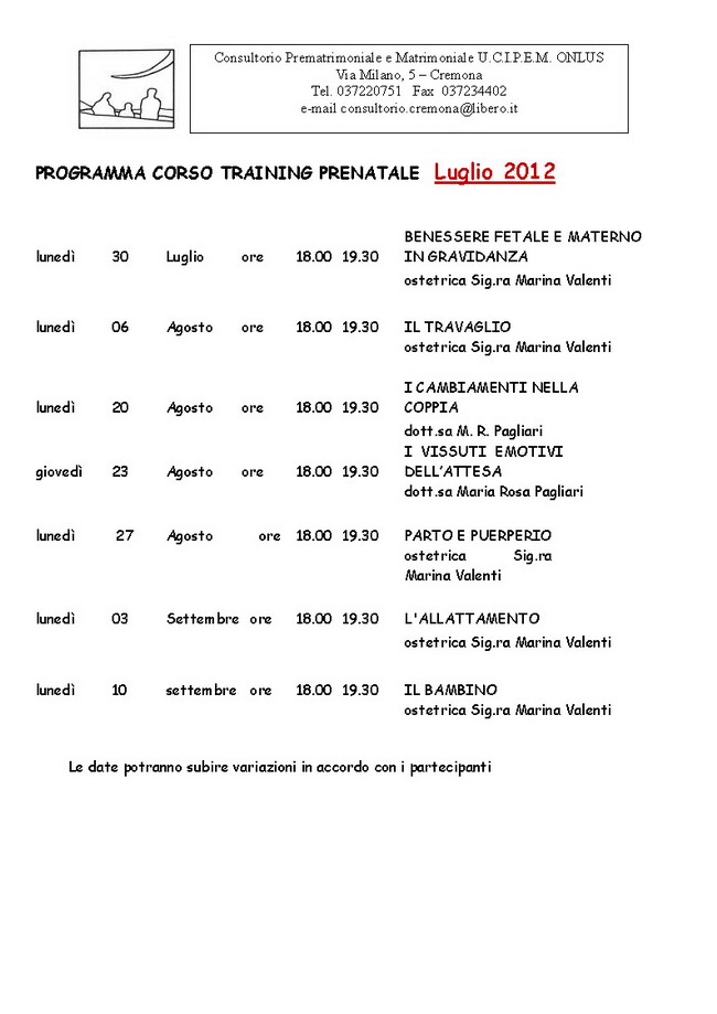 Consultorio UCIPEM Cremona Fondazione ONLUS - Via Milano, 5/C - 26100 Cremona (CR) - P.IVA: 01273220192 - C.F.: 80011480193 - Privacy policy