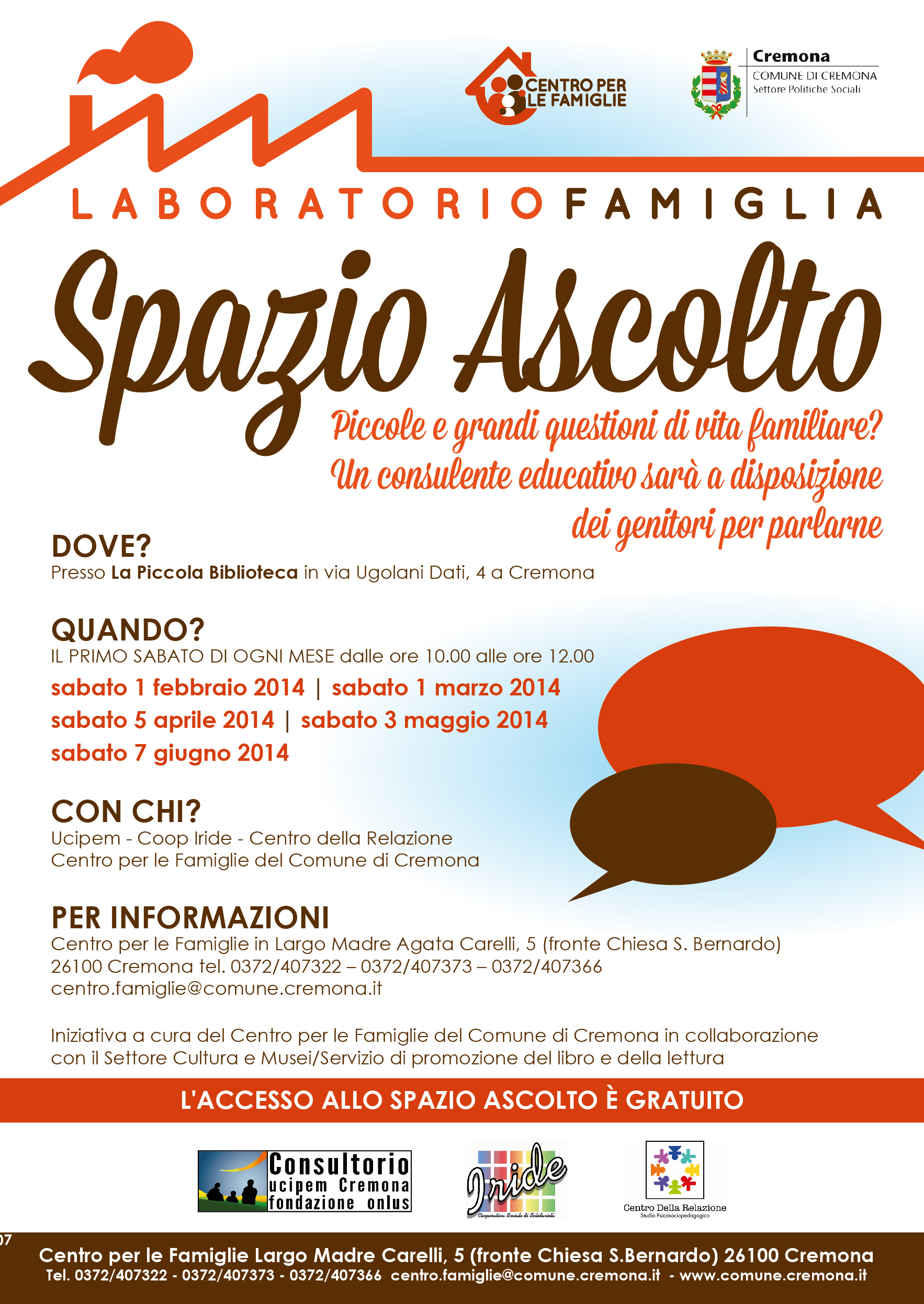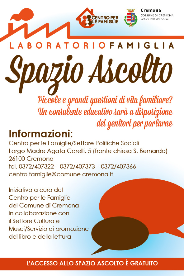 Il Centro per le Famiglie/Settore Politiche Sociali del Comune di Cremona, nell'ambito del progetto LABORATORIO FAMIGLIA, promuove e sostiene l'iniziativa denominata “SPAZIO ASCOLTO” rivolta ai genitori che vogliano sottoporre ad un consulente educativo piccole e grandi questioni di vita familiare.